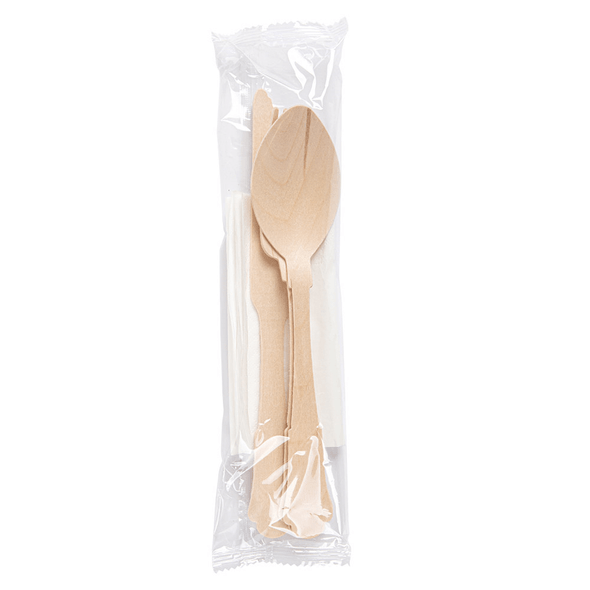 Ensemble de fourchette, couteau, cuillère et serviette en bois "classique"
